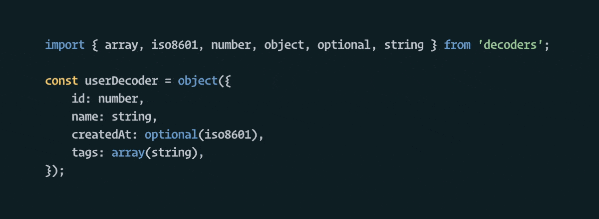 Data entering your application from the outside world should not be trusted without validation and often is of the any type, effectively disabling your type checker around input values. It’s an industry good practice to validate your expectations right at your program’s boundaries. This has two benefits: (1) your inputs are getting validated, and (2) you can now statically know for sure the shape of the incoming data. Decoders help solve both of these problems at once.